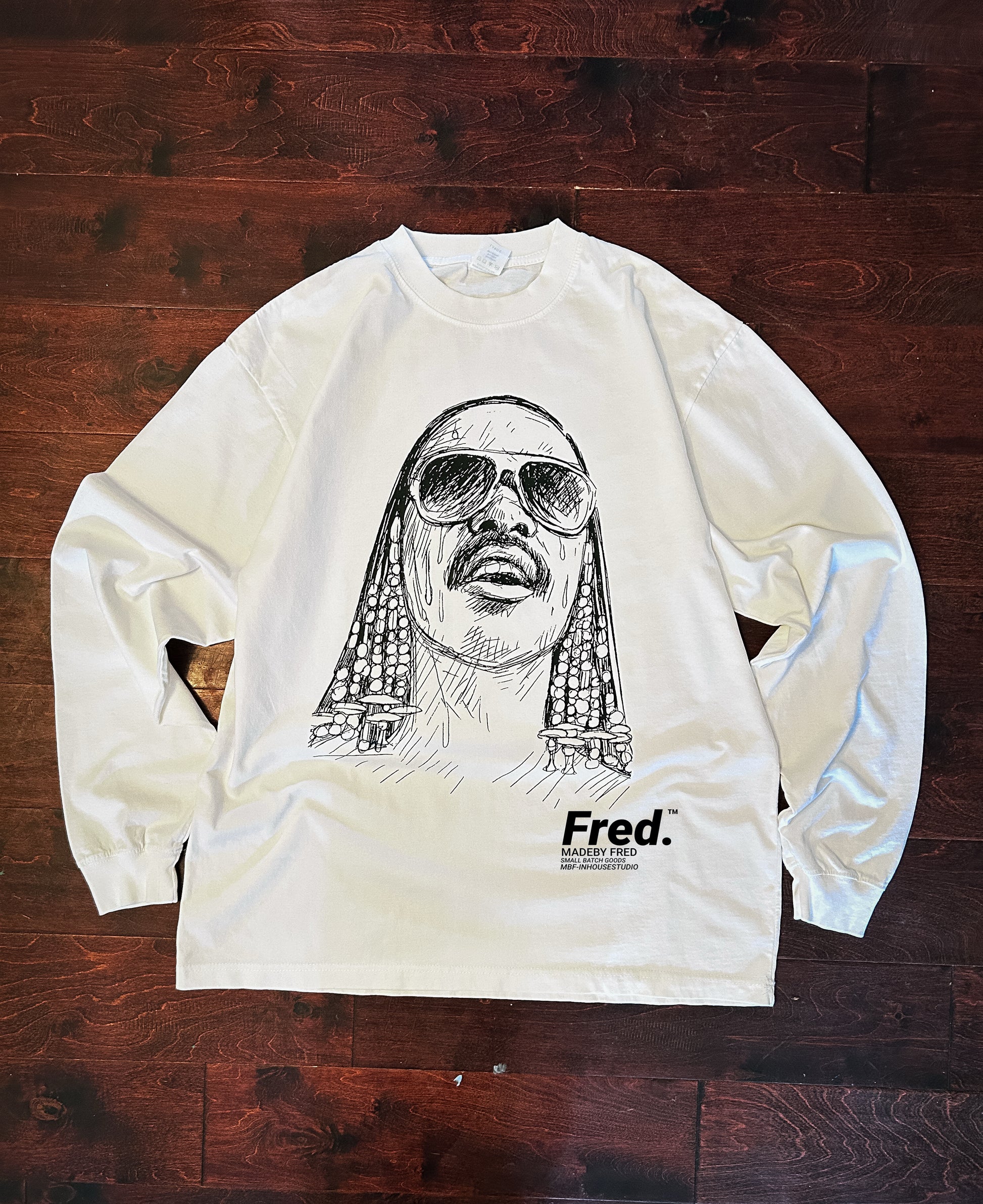 The front features a bold, hand-drawn line illustration of Stevie Wonder printed in deep black — a tribute to timeless soul and creative vision. Below, the Fred. mark and In House Studio tagline are printed clean and minimal, grounding the design in our signature mix of artistry and craftsmanship.